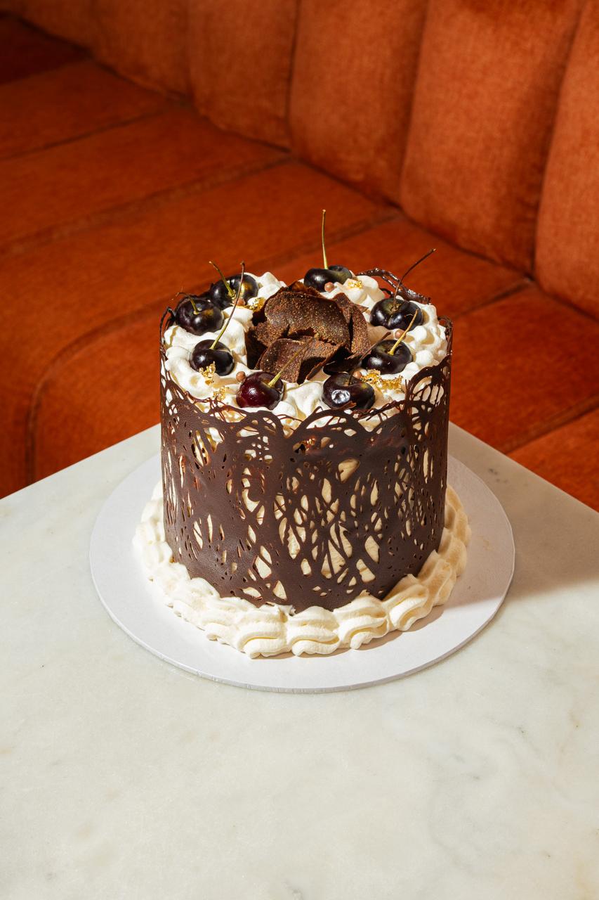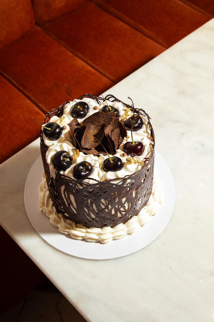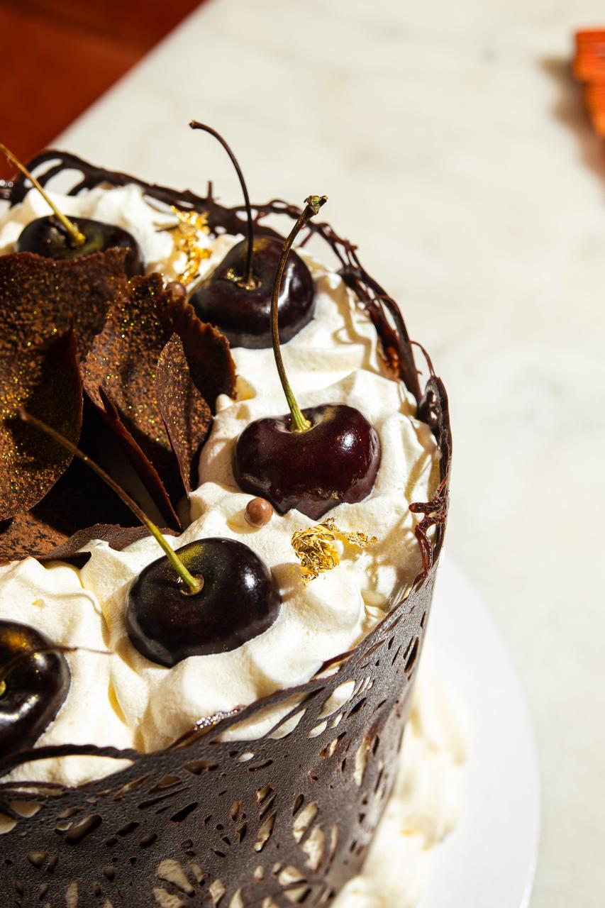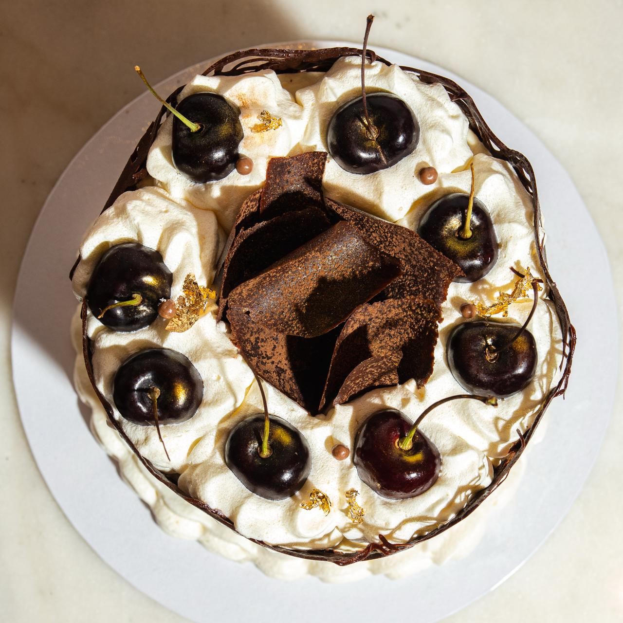 Traditional three-layer chocolate cake soaked in cherry syrup, filled with fresh black cherry compote and chocolate chantilly cream. Covered in fresh chantilly, decorated with chocolate lace, fresh cherries, chocolate feathers and a touch of gold dust.
