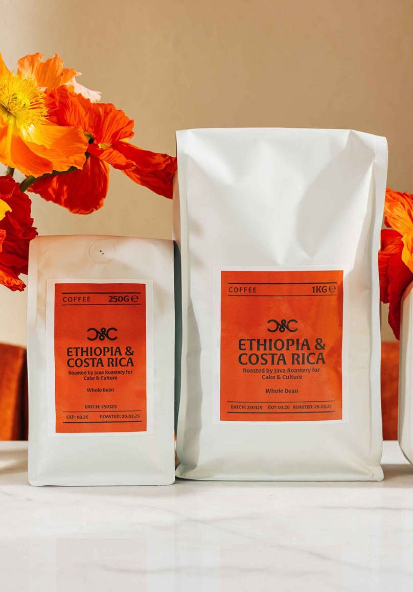A speciality house blend, roasted exclusively for Cake & Culture. It combines Ethiopian beans with notes of caramel, jasmine, and lemon, and Costa Rican beans featuring orange, dark chocolate, cherry, and caramel notes. The perfect balance of flavour and strength.