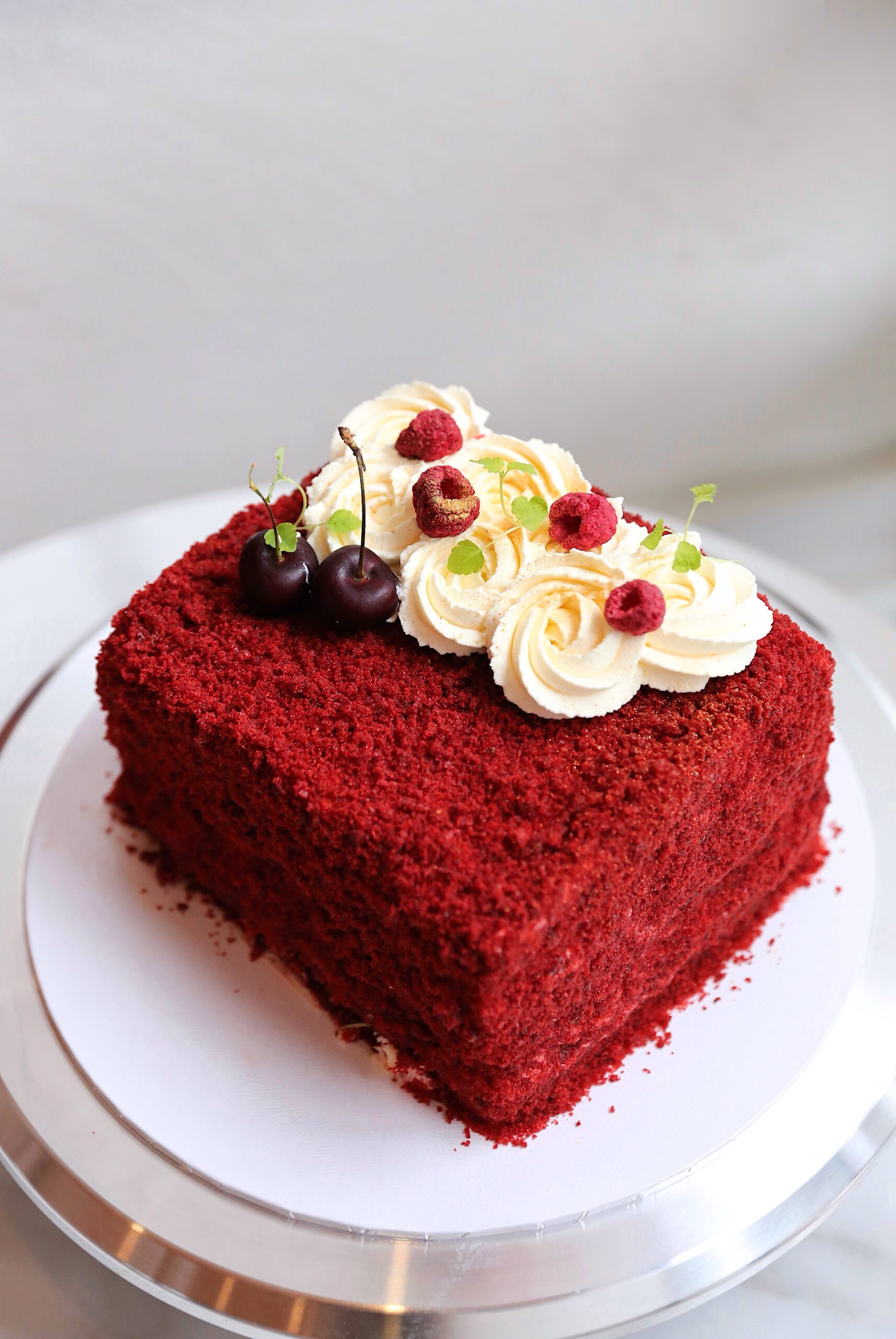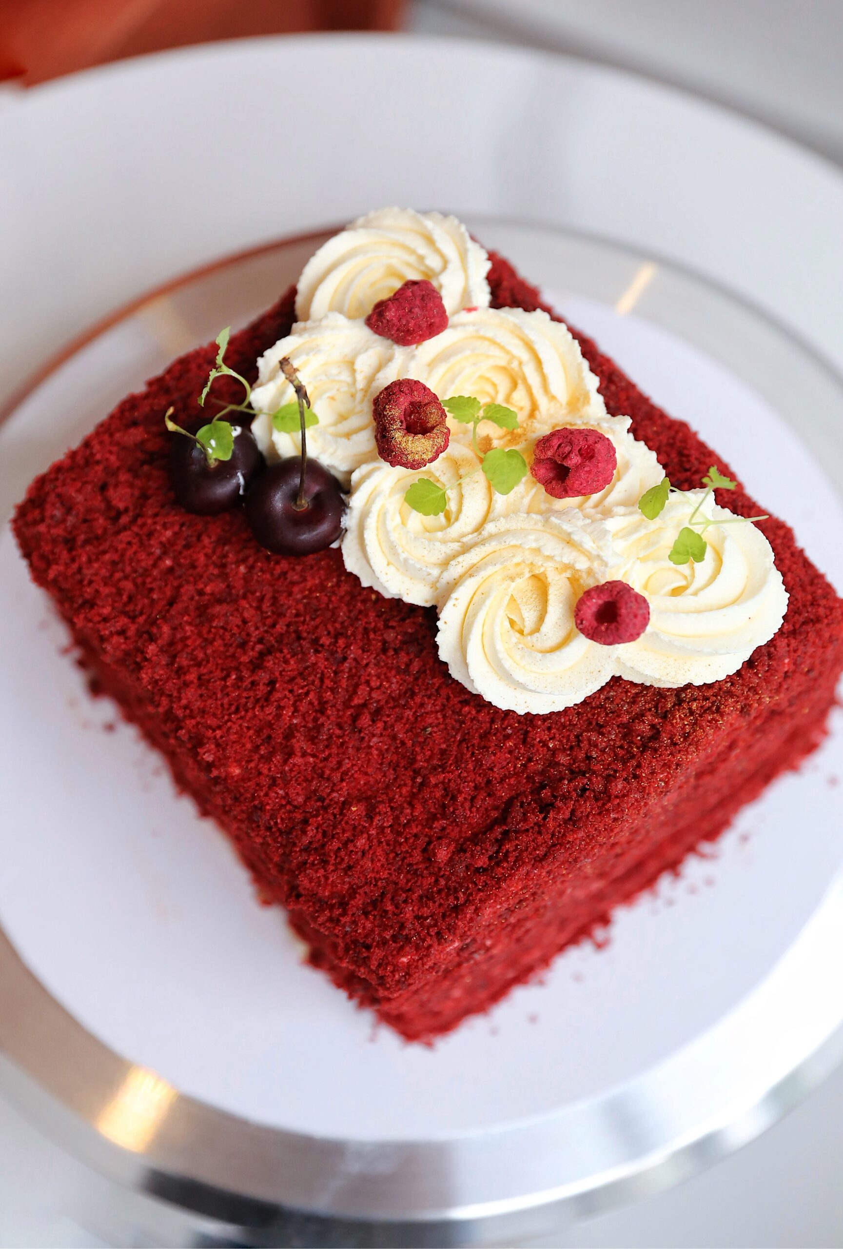 Luxurious red velvet cake with a hint of chocolate, layered with rich cream cheese frosting. Covered in red velvet cake crumbs and beautifully garnished with fresh berries, cherries and delicate macarons.
