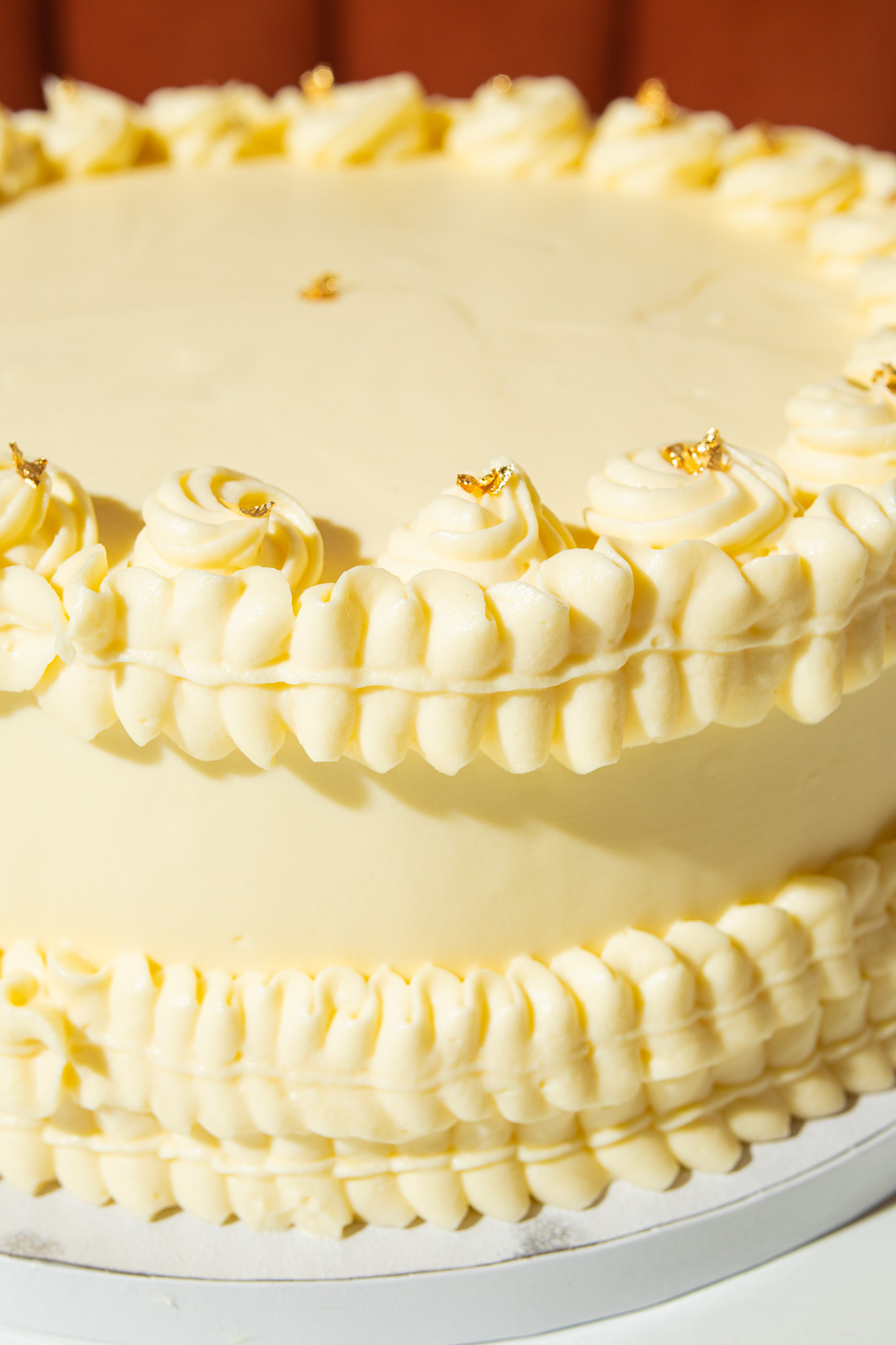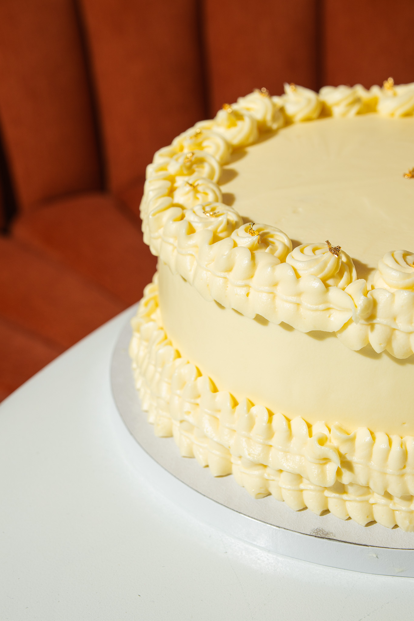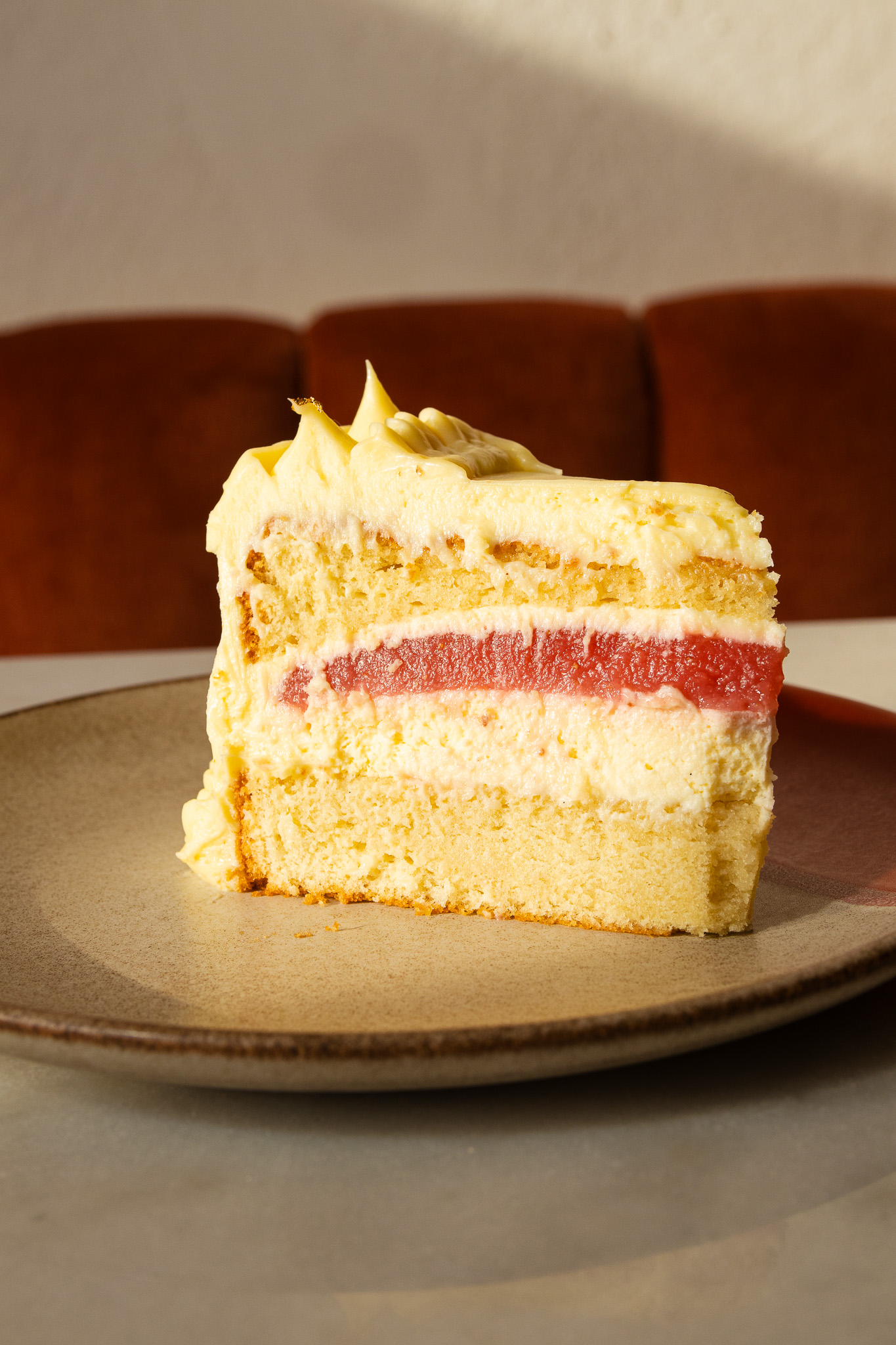 Classic Victoria sponge cake flavoured with maple syrup, filled with sweet and sour strawberry compote and smooth Italian meringue buttercream.